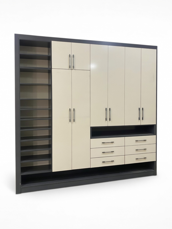 Cream/Beige Glossy Fitted Built-in Wardrobe with Open Shelving, Multi-Door Cabinets, and Lower Drawers