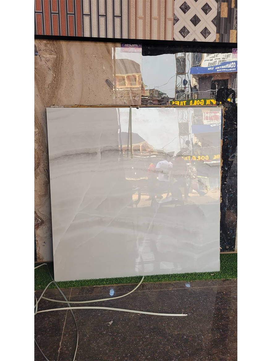 The panel is shown leaning against a wall at a building materials shop (with reflections of the street visible on its glossy surface). It pairs perfectly with other marble designs, including the black-and-white wavy optical illusion panel from your previous image. These PVC marble sheets are a very popular, cost-effective alternative to natural stone in contemporary Nigerian interior design.