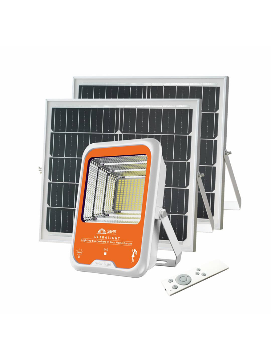 This is a high-performance, all-in-one solar-powered LED floodlight from SMS Ultralight series. It features a powerful 300W LED chip housed in a durable, weatherproof (IP66) white and orange body with a bright, wide-angle beam. It comes with two separate high-efficiency polycrystalline solar panels (30W each), a built-in large-capacity lithium battery (typically 192Wh), and a wireless remote control for easy on/off, brightness adjustment, timing, and mode selection. The system automatically turns on at dusk and off at dawn, with multiple lighting modes (including motion sensor option on some models). The adjustable bracket allows flexible installation on walls, poles, or ground. Designed for outdoor use, it is ideal for home gardens, compounds, security lighting, farms, construction sites, billboards, and street lighting where there is no electricity. It offers long working time (up to 8–12 hours on full charge), fast charging, and zero electricity bills.